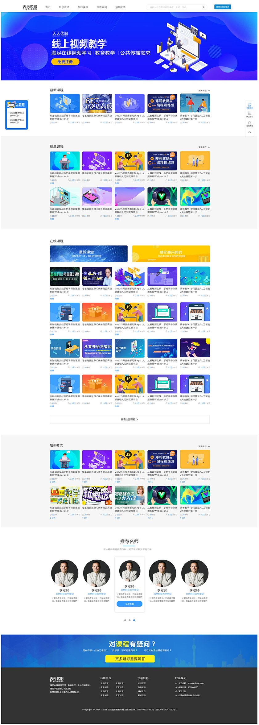 Project Description 满足在线视频学习,教育教学,公共传播需求, 建设学员管理,视频上传, 账号权限分级等商户后台管理功能 Official website address 新余http://tiantianyouzhi.com/ I want to share
